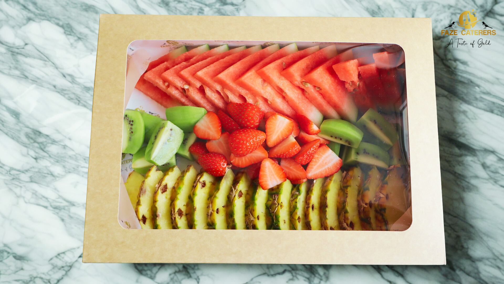 Product info: A colourful selection of four freshly sliced seasonal fruits, bursting with natural flavour and freshness. Perfect for sharing between 8–10 people.